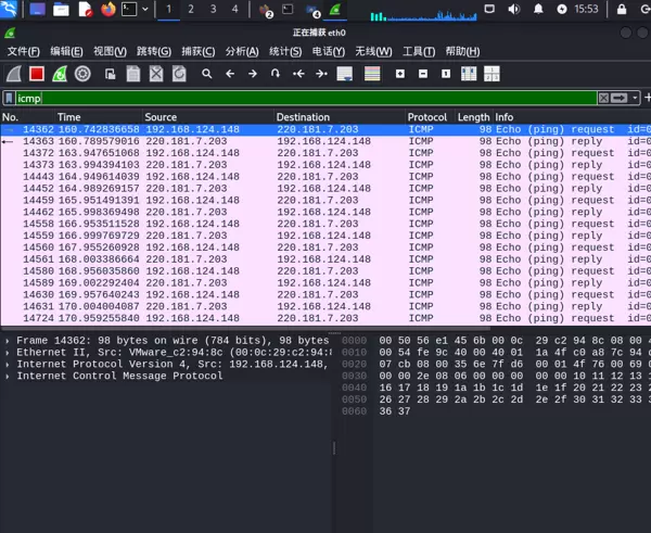 案例一:筛选ICMP协议流量 在过滤栏输入“icmp”,仅保留与ping操作相关的数据包。结果显示,源IP为192.168.124.148、目标IP为220.181.7.203的ICMP消息成对出现,包含Echo Request与Echo Reply类型,每条数据包长度均为98字节,完整还原了ICMP请求-响应的交互过程。