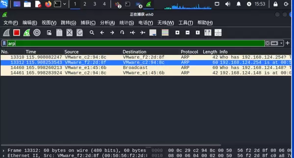 案例二:捕获ARP协议通信 启用“arp”过滤条件后,可清晰看到地址解析过程中的查询与应答报文。例如,“Who has 192.168.124.254?”表示主机发起MAC地址询问,随后收到“192.168.124.254 is at XX:XX:XX:XX:XX:XX”的回复,直观体现了IP地址与物理地址之间的映射机制。
