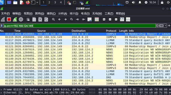 案例3:使用过滤表达式 “ip.src==192.168.124.148”(实验截图中源 IP 为 192.168.124.149,可根据实际环境调整),即可获取该主机发出的所有通信数据。其中包括 IGMPv3 组播报文、LLMNR 查询请求、NBNS 名称注册等信息,全面反映目标主机的网络活动情况。