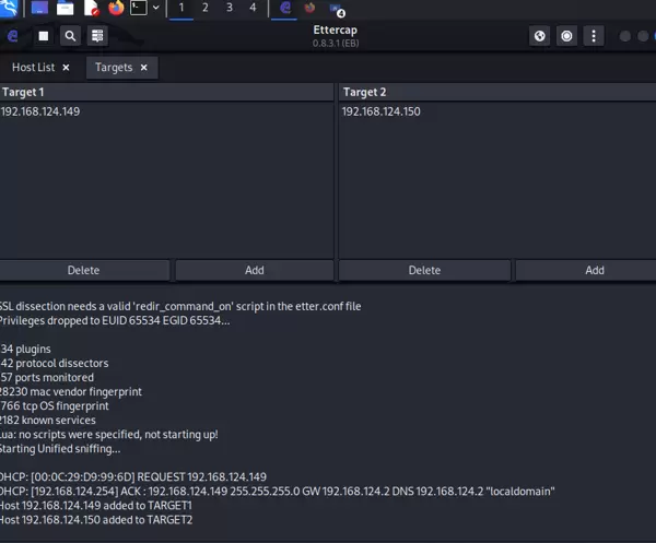 - 目标设定:在 “Hosts list” 列表中,将默认网关(如 192.168.124.149)设为 “Target 1”,被欺骗主机(如 192.168.124.150)设为 “Target 2”,建立“网关←→攻击者←→受害者”的通信拦截路径。