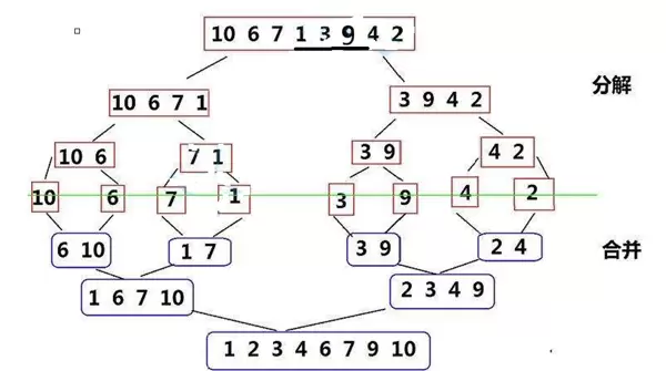 - 主要不足在于需额外开辟 O(N) 的存储空间;其设计思想常被应用于磁盘外排序场景中。