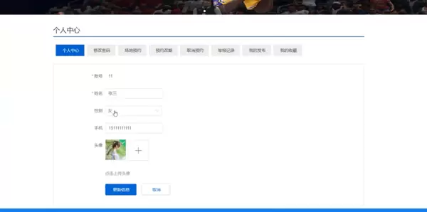 前端界面采用Vue + Element UI 构建,实现响应式布局,适配PC端与移动端。用户可通过首页轮播图了解最新活动,点击“场地预约”进入选择页面,按日期和时段筛选可用场地。