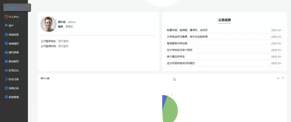 在功能设计方面,系统实现了多角色权限管理机制,不同用户拥有对应的操作权限。普通用户可通过系统完成注册与登录,浏览场地详情、查看公告内容、参与在线论坛交流,并支持个人信息的编辑与维护。