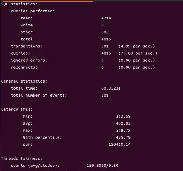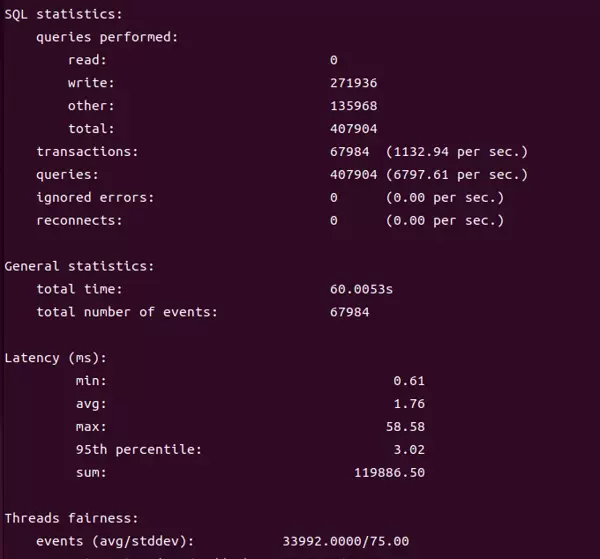 sysbench输出的日志文件中包含多项关键性能指标,用于全面评估数据库性能: