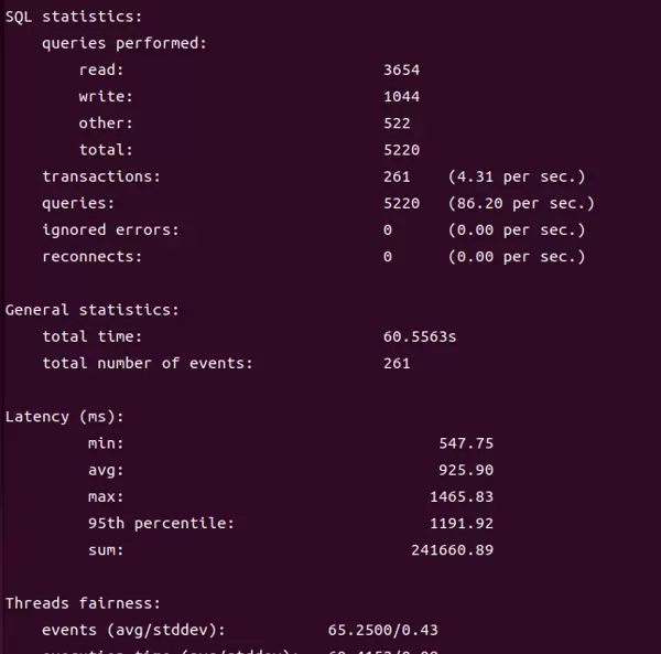 | TPS(4.31persec) | 4.31 事务 / 秒 | 接近该内存配置下的理论最优值(理想上限为 5–6 TPS) |