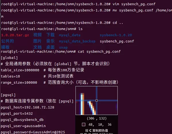 sysbench 通过 PostgreSQL 协议驱动与 openGauss 建立连接,需配置数据库类型、主机地址、端口、用户名、密码以及目标数据库名称。为了简化后续测试命令的输入,我创建了一个名为 sysbench_pg.conf 的配置文件,内容如下: