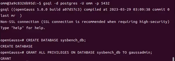 登录成功后执行以下 SQL 语句:su - omm # 使用管理员账户连接数据库 gsql -d postgres -U omm -p 5432-- 创建测试用数据库 CREATE DATABASE sysbench_db; -- 授予 gaussadmin 用户完整权限 GRANT ALL PRIVILEGES ON DATABASE sysbench_db TO gaussadmin; -- 退出 gsql 客户端 \q