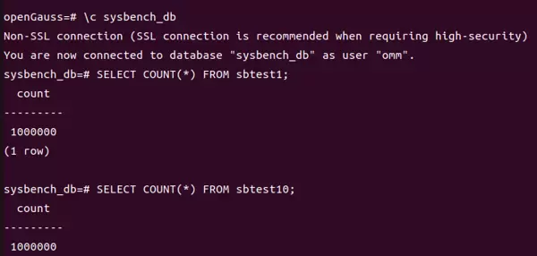 在数据生成阶段,sysbench会自动于sysbench_db数据库中创建10张表,分别为sbtest1至sbtest10。每张表均包含四个字段:id、k、c和pad,并为id字段建立主键索引。完成数据准备后,可使用openGauss的命令\d sbtest1查看表结构,并通过执行SELECT COUNT(*) FROM sbtest1;来验证数据记录数是否达到100万条。