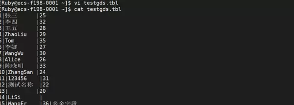 在目录 /home/Ruby/gds/ 下创建名为 testgds.tbl 的文件,并写入以下测试数据: