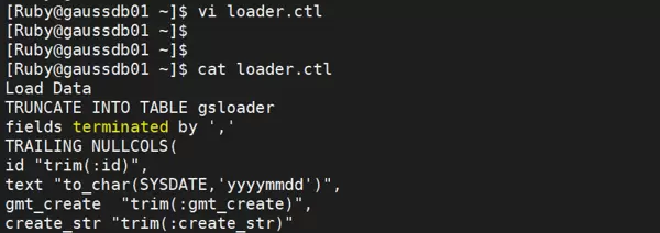 Load Data TRUNCATE INTO TABLE gsloader fields terminated by ',' TRAILING NULLCOLS( id "trim(:id)", text "to_char(SYSDATE,'yyyymmdd')", gmt_create ?"trim(:gmt_create)", create_str "trim(:create_str)" )