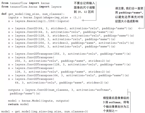 然而,与第8章中的分类模型相比,本例在下采样策略上有所不同:之前使用的是 MaxPooling2D 层进行降维处理,而本模型则选择在每隔一个卷积层中使用带有步幅(stride)的卷积操作来实现下采样。(若需回顾卷积步幅的工作原理,可参考第8.1.1节“理解卷积步幅”。)之所以做出这种调整,是因为图像分割任务对空间位置信息高度敏感——最终需要为每一个像素生成对应的类别掩码。而传统的 2×2 最大池化会破坏局部窗口内的精确位置信息,因为它仅输出一个标量值,无法反映该值来自窗口内哪一个具体位置。这在分类任务中影响不大,但在分割任务中会显著降低性能。相比之下,带步幅的卷积能够在有效缩小特征图尺寸的同时,较好地保留空间结构信息。后续章节(例如第12章的生成式模型)也会体现这一原则:当模型依赖于特征的空间定位能力时,通常优先选用步幅卷积而非最大池化。