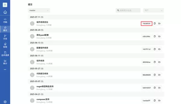 每条提交记录都有一个由Git生成的唯一标识符——commitId。在界面上仅显示前8位字符,但可通过点击“复制”按钮获取完整的commitId值。