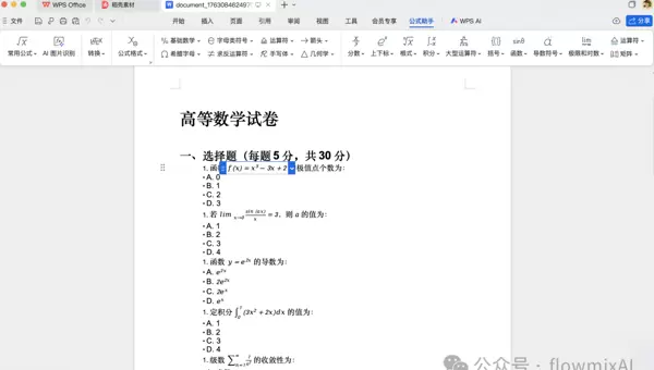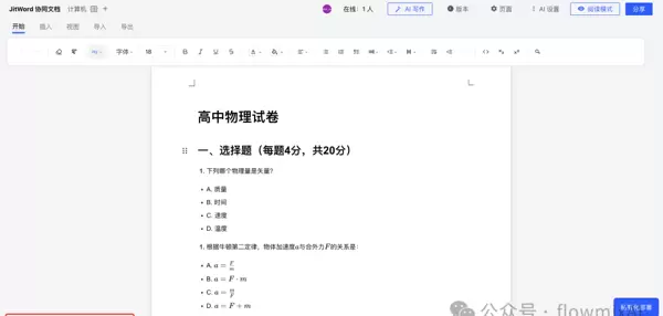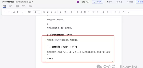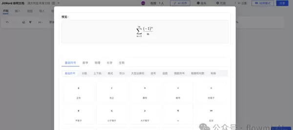 内置公式编辑器覆盖数学、物理、化学等多个专业领域,支持 AI 自动生成含公式的文档内容,并允许对已有公式进行二次编辑。