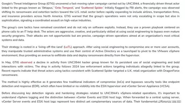 关键词:UNC3944;语音钓鱼;权限劫持;勒索软件;vSphere安全;身份基础设施;威胁检测
