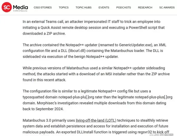 2025年7月,Morphisec 披露了一起针对某企业用户的定向攻击案例:攻击者通过 Teams 的外部通话功能伪装成 IT 支持人员,诱骗用户启用 Windows 内置的 Quick Assist 远程协助工具,并执行一段 PowerShell 脚本,最终成功植入 Matanbuchus 3.0 恶意加载器。经分析确认,该版本是对2021年首次出现的 Matanbuchus 恶意软件即服务(Malware-as-a-Service, MaaS)架构的一次彻底重写,不仅在技术实现上完成升级,更在规避检测、增强隐蔽性方面表现出更强的能力。