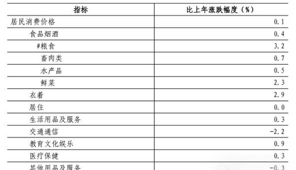 价格水平保持稳定。全年居民消费价格同比上涨0.1%;工业生产者出厂价格下降0.5%;工业生产者购进价格上涨0.3%。