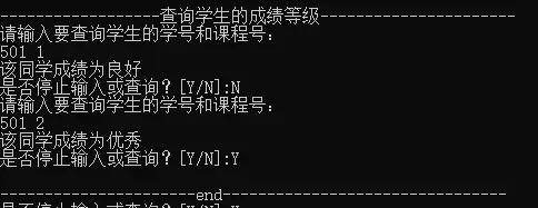 - 功能5:输入特定学生的学号和课程编号后,返回该科目对应的成绩等级