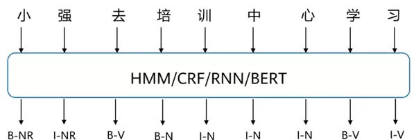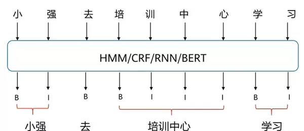 常用标注体系中,B表示新词的起始位置,I表示延续前一个词的部分。