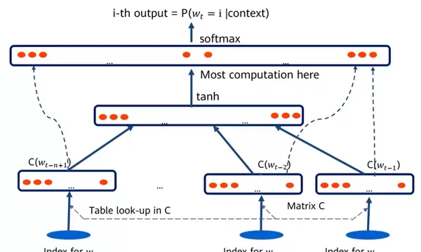 在此类模型中,输入为固定大小的滑动窗口内的词。每个词首先被转换为对应的词向量,随后这些向量按顺序拼接成一个联合输入,送入隐藏层进行处理。最终输出结合所有词向量信息,通过 softmax 层产生对下一个词的概率预测。