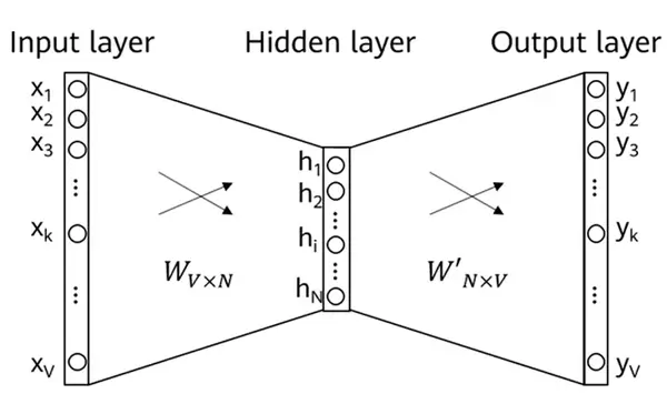 在此过程中存在两组权重矩阵U和V,分别对应输入到隐藏层、隐藏层到输出层的连接权重,最终概率由这两个词向量的内积决定。