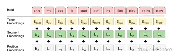 BERT 模型通过堆叠多个 Transformer 编码器层构成,其输入嵌入由三种向量相加而成: