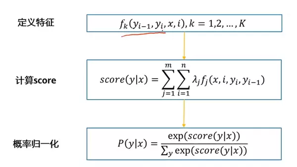 特征函数 $f$ 的输入包括整个句子文本 $x$ 和标签序列 $y$,其中 $y$ 可涉及相邻两个位置,从而捕获标签间的转移模式。由于考虑的是整条标签路径,因此实现了全局归一化。