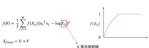 目标是让任意两个词的向量乘积尽可能逼近其共现频率的对数值。引入权重函数$f$,用于调节高频共现对损失的影响——频率越高,权重越大,学习优先级更高。