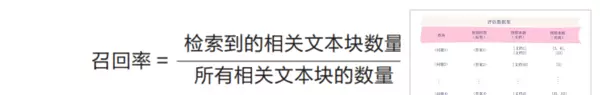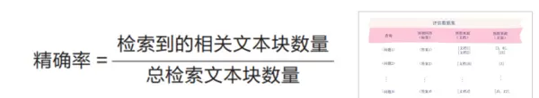 精确率用于衡量被检索出的文本块中有多少与当前查询真正相关,计算方式为:检索到的相关文本块数量除以总检索出的文本块数量。该指标试图回答:“在所有返回的结果中,有多少是用户真正需要的?”