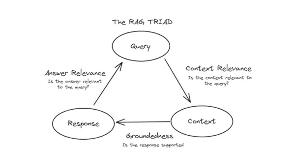 RAG(检索增强生成)系统的核心质量评估框架被称为“RAG TRIAD”——即评估三角模型。该模型从三个相互关联的维度出发,构成了衡量RAG输出质量的“体检表”。三者相辅相成,缺一不可。