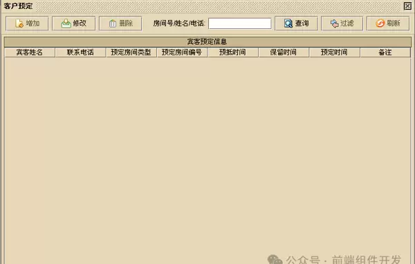 - 查询预订:在“房间号/姓名”输入框中键入关键词,点击“查询”即可筛选匹配结果。也可点击“过滤”按钮设定更多条件以缩小范围。点击“刷新”可重置并展示全部预订记录。