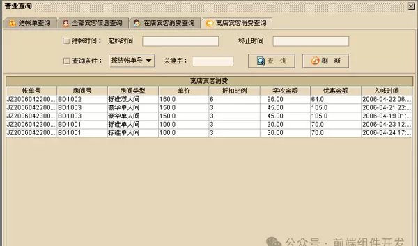 选择账单时间类型,并设定起止时间后点击查询,系统会列出该期间内所有离店宾客的消费信息。