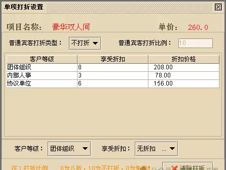 商品打折: 在“商品项目”设置中可对特定商品启用打折功能。例如选择“啤酒”后点击“打折设置”,系统会弹出窗口列出所有客户类型,允许为每一类设置独立的折扣率。此折扣优先级高于全场统一折扣,适用于推出特价商品或针对特定客户群体的促销策略。