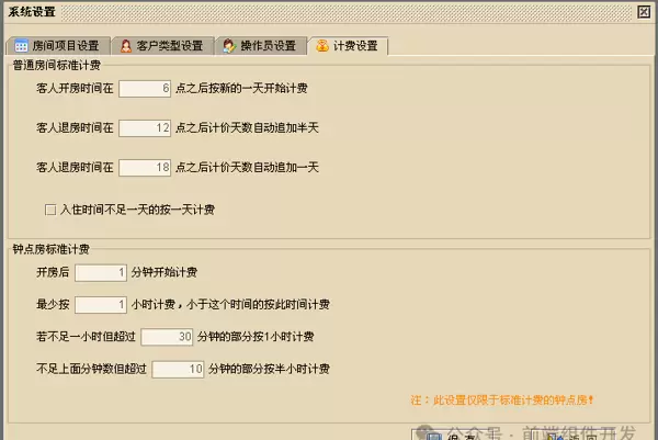 (2)全天/钟点计费模式:决定房间开始计费的方式,一旦宾客登记入住,系统即按此规则启动计费流程。