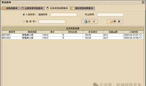 选择“营业查询→在店宾客消费查询”菜单项进入查询界面。