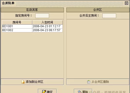 将光标停留在“在店宾客”列表中的某条记录上,按下回车键、双击鼠标或点击带有向右箭头的按钮,即可将该宾客添加至“合并区”列表。如需添加多个房间,操作方式相同。带有向左箭头的按钮功能与之相反,用于将已选账单从合并区移回。