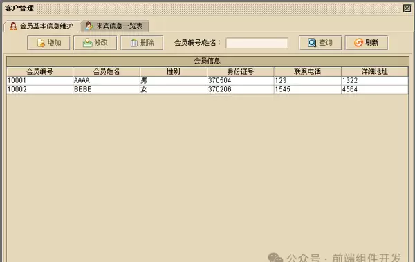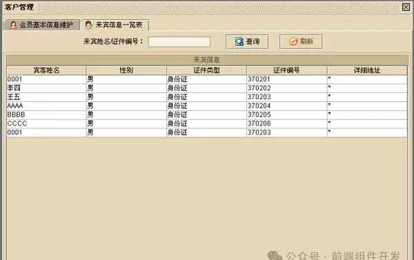在来宾信息一览表中,可通过输入客户编号或姓名进行检索,系统将展示符合条件的所有客户信息。