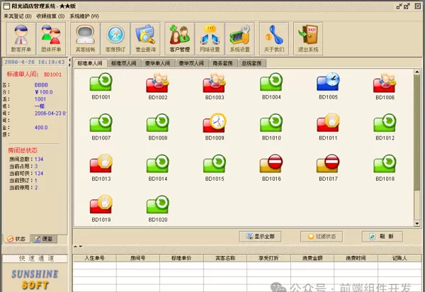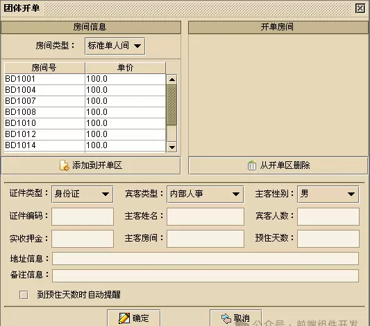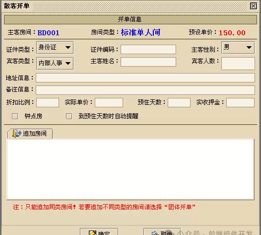 来宾登记 → 散客开单(团体开单): 每位宾客在产生消费前必须先完成登记流程,建立客户账户,并为其分配一个已设定好的房间项目。只有在“系统设置”中已定义的房间才能被用于登记操作。