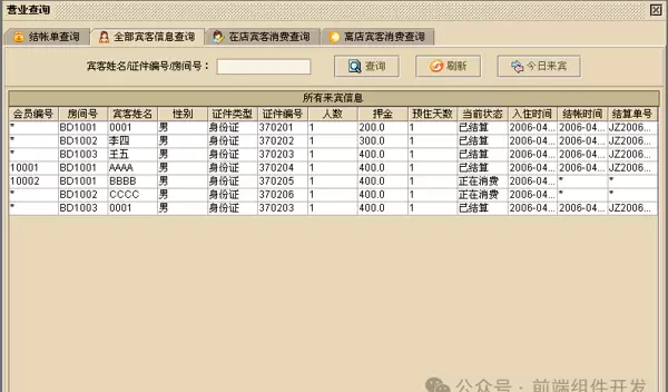 进入方法为点击“营业查询→全部宾客信息查询”,打开查询窗口。