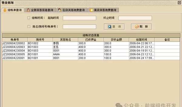 此外,也可通过输入宾客姓名、房间号或账单号进行精确查找,提交查询请求后,相关信息会即时显示在结果区域。