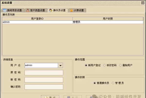 功能概述:用于操作员账户的注册、信息修改与删除管理。