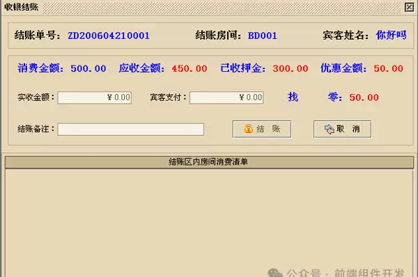 结账房间信息区:显示当前房间的账单编号、房间号及宾客姓名。