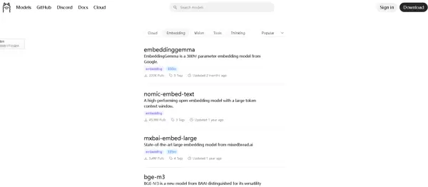 例如搜索“bge-m3”模型,这是一个常用于文本嵌入处理的模型,适用于构建本地知识库,无需额外配置即可使用。