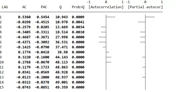 - 滞后1阶较高(0.5454),滞后2阶为负值(-0.4515),之后逐步减小;