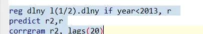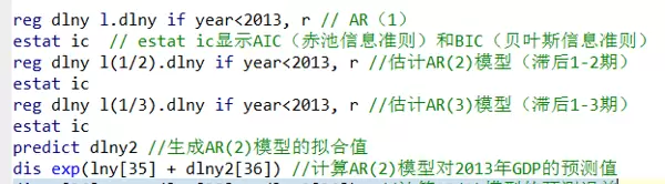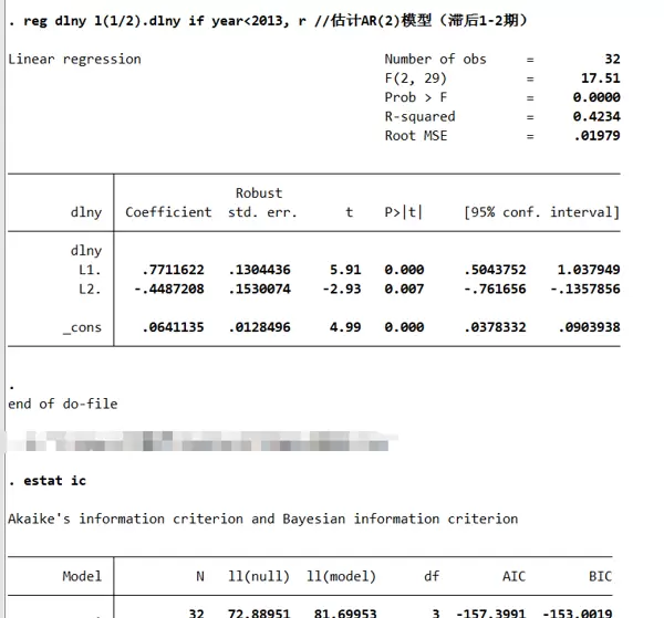 - 在 AR(2) 中,二阶滞后项 `L2.dlny` 的 p 值为 0.007,在 1% 水平上显著。