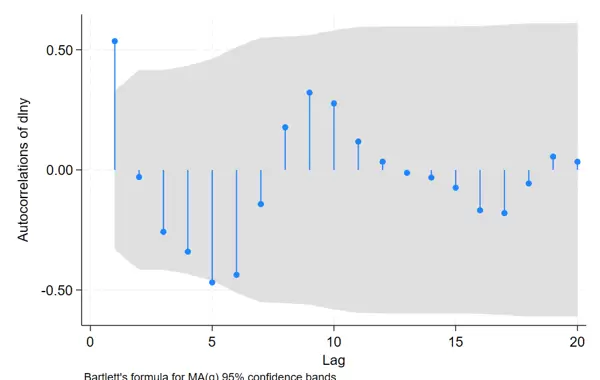 图中阴影部分代表置信区间。若某阶自相关系数落在该区域之外,则认为其显著异于零。
