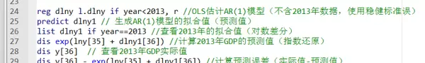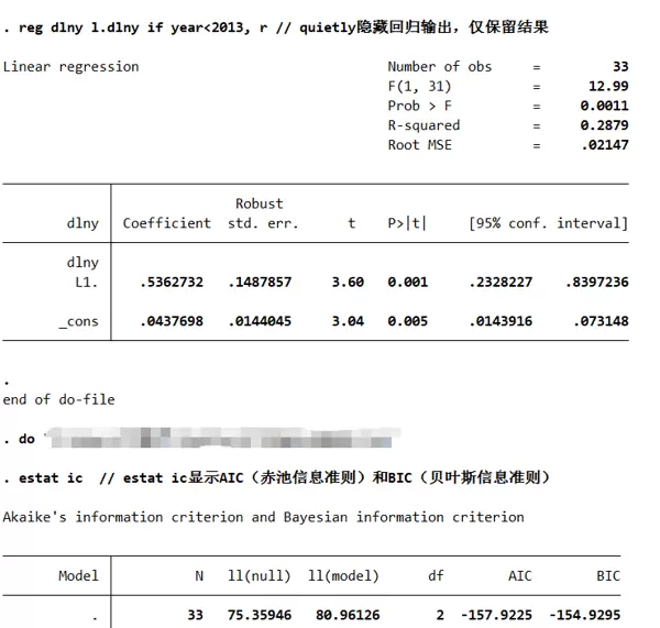 - 避免遗漏变量偏差:若真实过程为 AR(2),但错误采用 AR(1),将忽略显著的 `L2.dlny` 项,导致估计有偏。