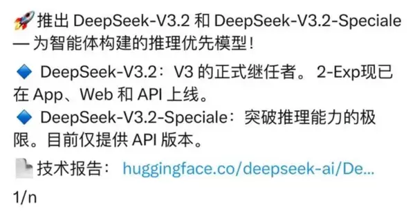 12月1日晚间,DeepSeek正式推出两款全新模型——DeepSeek-V3.2与DeepSeek-V3.2-Speciale,在推理能力方面表现卓越,位居全球前列。