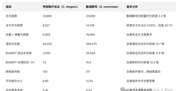 本文展示了两个示例数据集的应用效果:其一涵盖 14,986 篇与秀丽隐杆线虫(Caenorhabditis elegans)相关的论文及摘要;其二包含 33,606 篇关于酿酒酵母(Saccharomyces cerevisiae)的研究资料。所提取的关系进一步整合自 KEGG、WikiPathways、UniProt 和 LipidMaps 等权威数据库,并通过网络图谱进行可视化呈现。同时,研究还比较了不同方法在构建这些网络时所需的时间开销。