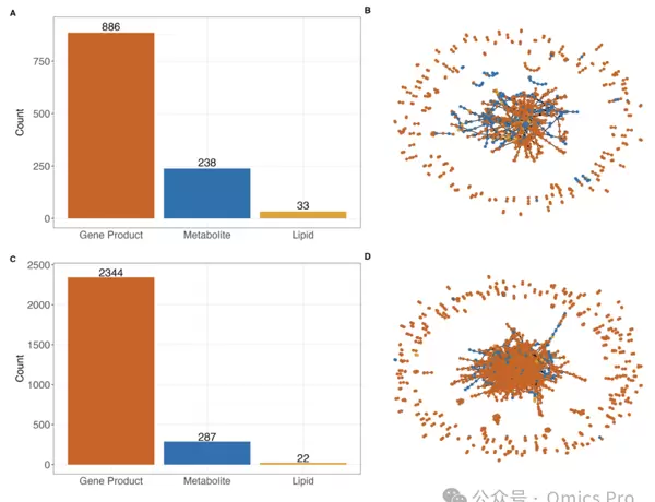 (D)结合文献与数据库信息构建的酿酒酵母多组学网络(基于 C 中术语筛选)。其中,朱红色节点表示基因产物,蓝色代表代谢物,橙色代表脂质;边表示经文献或数据库确认的两术语间的关系。